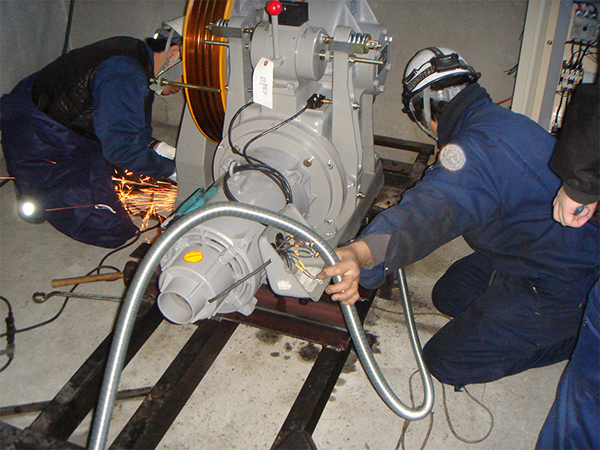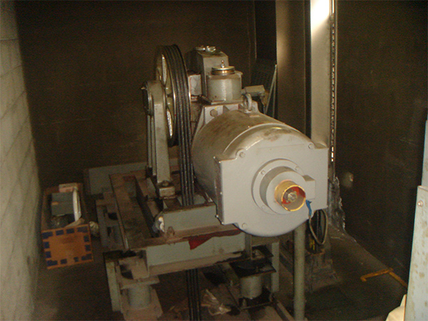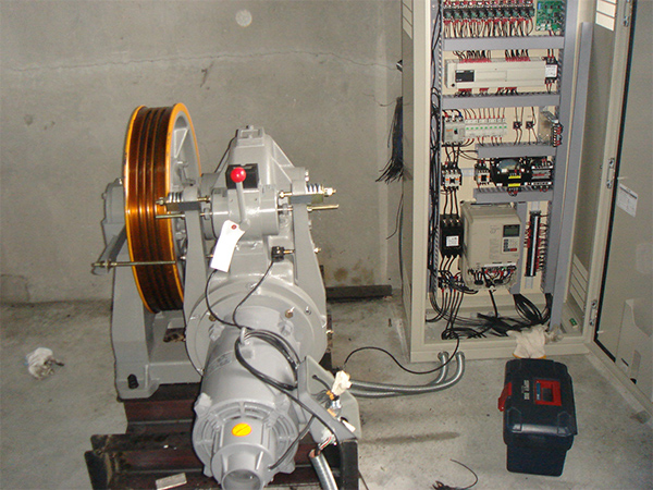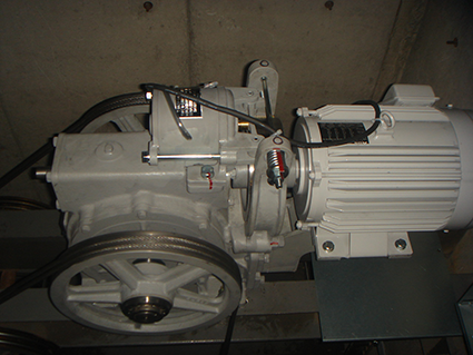 新型の巻上機は電動機ウオームギヤ、トラクションシープなどを一体にして、また着床誤差が少なく音と振動のない静かな巻上機です。